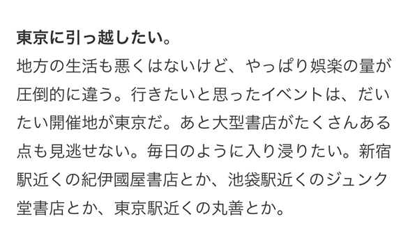 いま住んでいるところも、決して悪くはない。東京から遠いし大型書店もないけど、生活に必要な施設は一通りそろっている。スーパー、コンビニ、ドラッグストア、飲食店、ホームセンター、家電量販店、映画館、カラオケ店、ボウリング場。